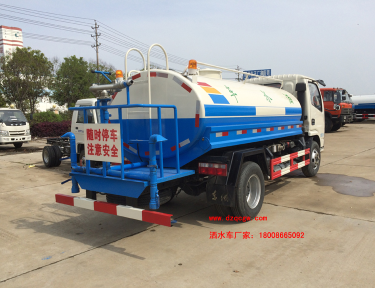 改裝部分:標配前沖、后灑、側噴、工作平臺、綠化高炮、自流閥、消防接口,輸水管3米2根,8噸以上罐體帶高位花灑2個,億豐泵或金龍泵,控制方式為手動。選裝氣動閥門控制;高位花灑,大鴨嘴,藥盤,罐體側面加裝萬向可調節噴頭,罐體后部壓塵噴灑裝置,兩個圓警燈或長警燈,LED箭頭燈,泵可選裝威龍泵或農藥噴霧裝置。